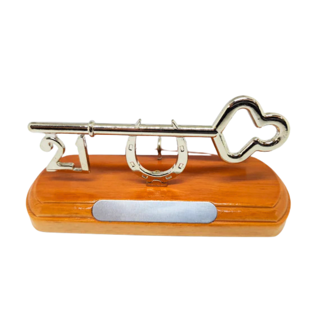 Silver Key on wooden stand. Available in different sizes. Personalised Engraving Available.